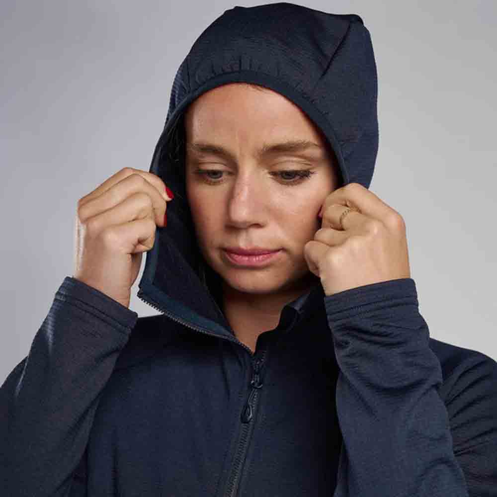 Montane Protium 女士連帽抓絨外套保暖重量比高,透氣性極佳。這款暢銷產品採用流線型縫線,90% 以上材質為再生材質製成。高性能 THERMO GRID 抓絨衣能夠適應各種天氣條件,保持核心部位溫暖,保持皮膚乾爽,並配有可佩戴頭盔的風帽。