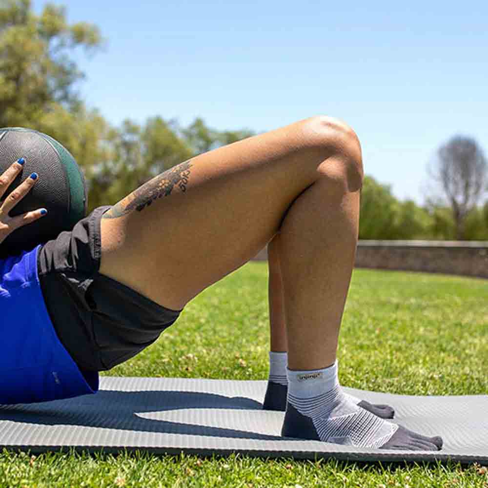 Engineered to perform on all surfaces, our lightest weight running sock delivers high-quality performance without the bulk. The innovative five-toe design prevents blisters, manages moisture, and promotes total foot utilization–whether you are running a marathon or around the block. Lightweight fibers and arch support enhance comfort, while the Mini-Crew height provides ankle-high debris protection. Made for the miles, this performance running sock will level up your endurance game.