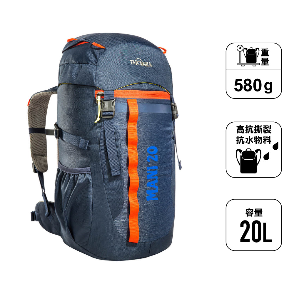 Tatonka的Mani兒童背包容量為20公升,適合十歲至十二歲左右的兒童。 由於其舒適的攜帶系統,它可以用於徒步旅行或長途旅行。