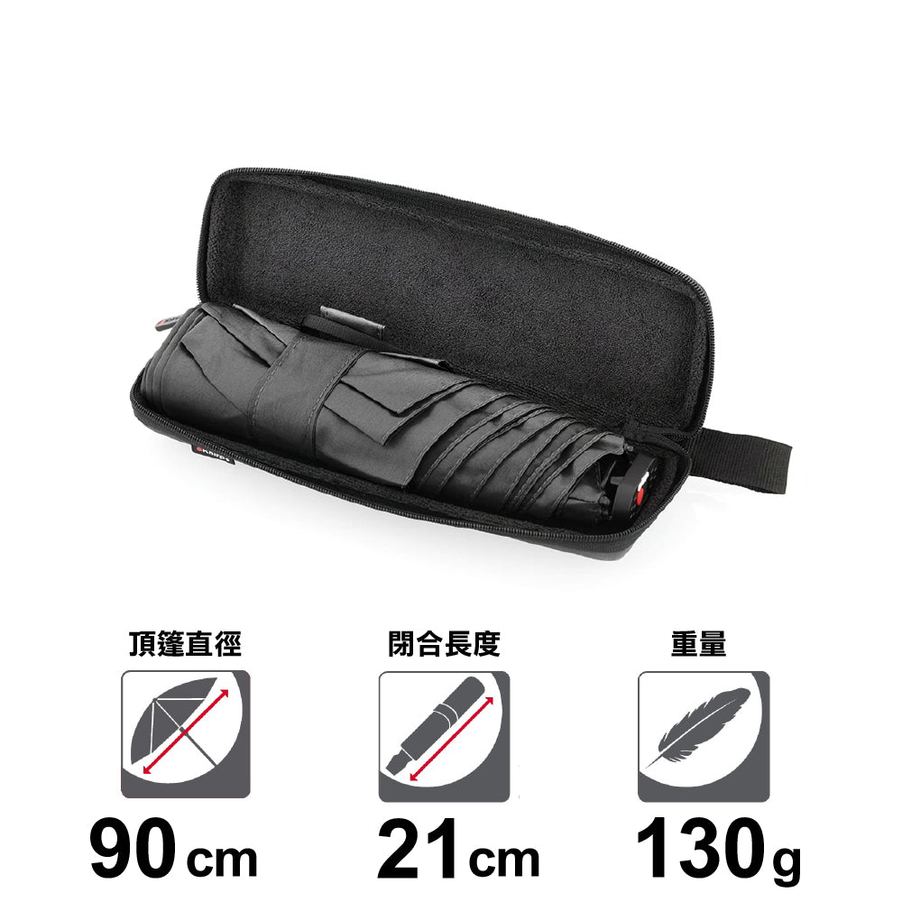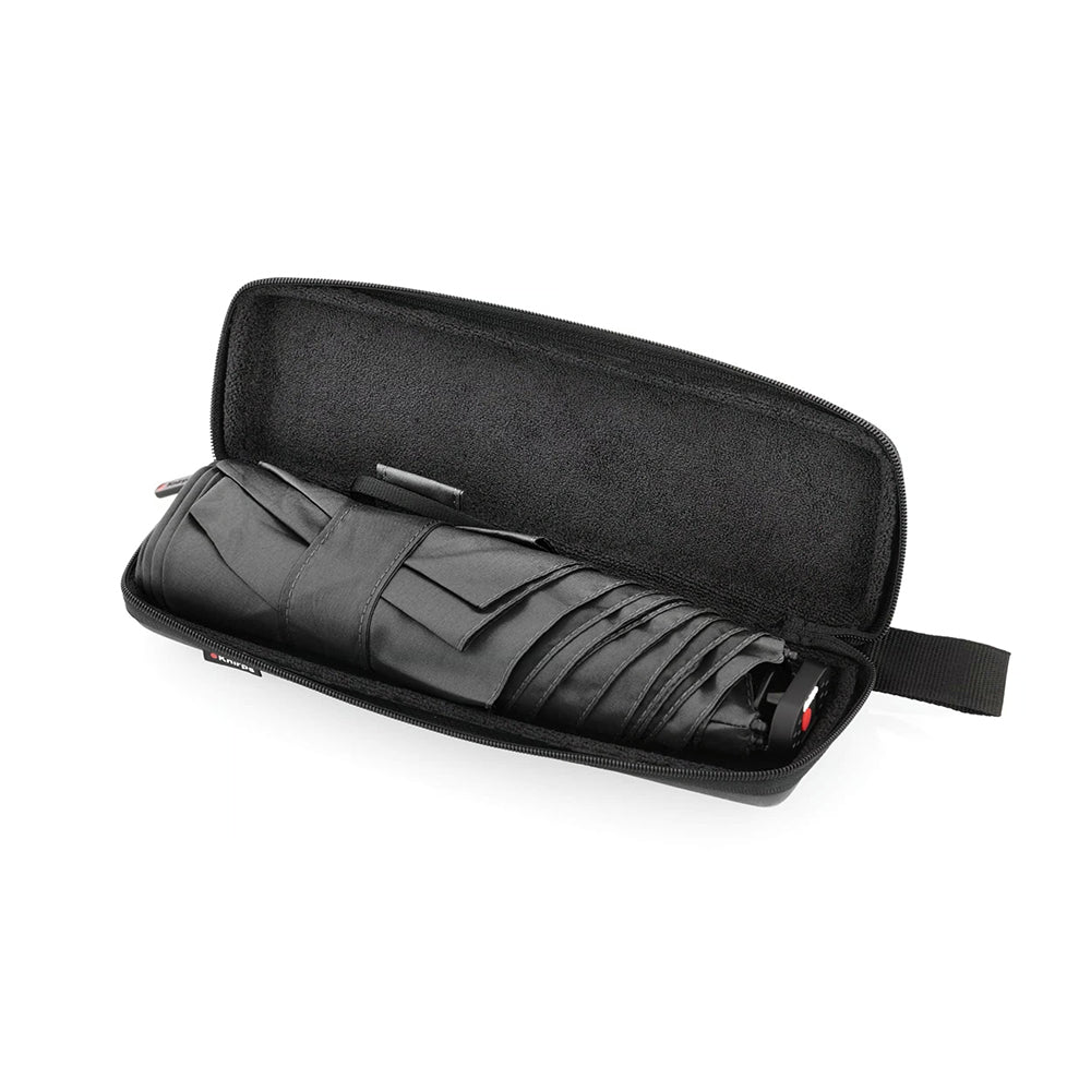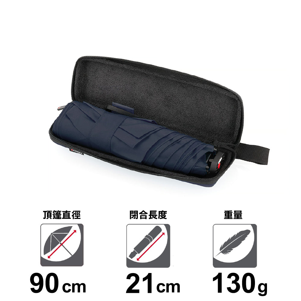 該包配有吸水的超細纖維布,可以巧妙地保護包中所有對水敏感的物品免受潮濕。雨傘重量僅 130 克,包裝尺寸小巧,可隨時供您使用。輕鬆的操控和風中的穩定性彰顯了近 100 年的「德國工程」。