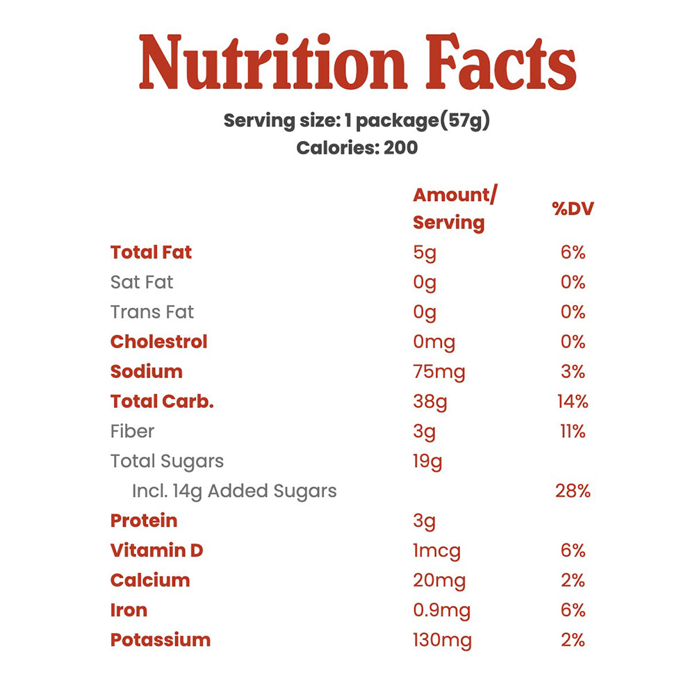 全麥麵粉、無花果醬、蔗糖、糙米糖漿、菜籽油、全麥燕麥、甘油、果汁(用於調色)、海鹽、檸檬酸、小蘇打。含有小麥。