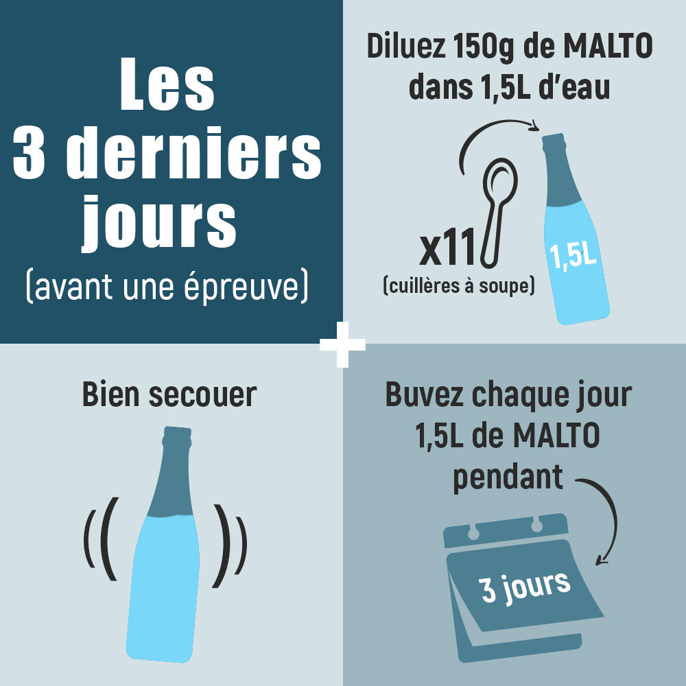 MALTO ULTRA ensures the increase in your energy reserves without having to eat large quantities of food: You eat reasonable amounts at meals and your hydration is ideal for the event. The use of MALTO ULTRA, made up of 94% slow carbohydrates (glycemic index < 15), is a considerable asset!