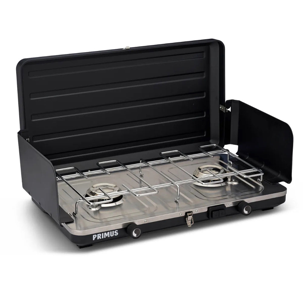 一款簡單可靠的雙爐頭露營爐,帶有擋風罩,是您在露營地或房車旁輕鬆烹飪的理想之選